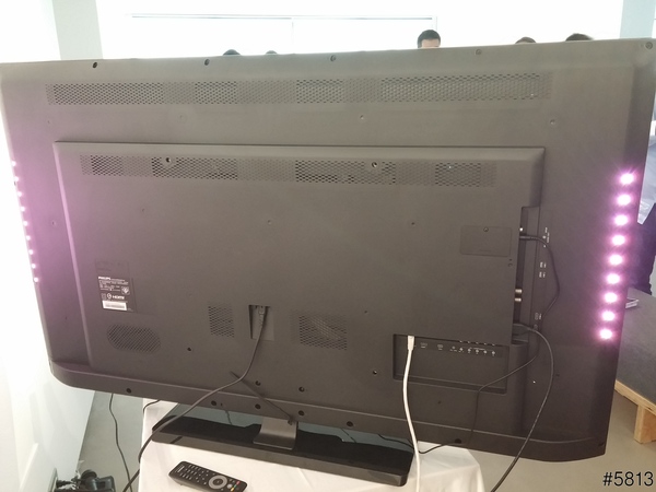 這是在電視背後兩邊放上LED燈條,因為一般在家中電視多會靠壁擺放,且家中電燈通常不會太亮,這時LED燈條會依電視畫面發出相對應的光線,透過壁邊反射,來達到畫面更柔和,顏色對比效果更強烈的感覺。