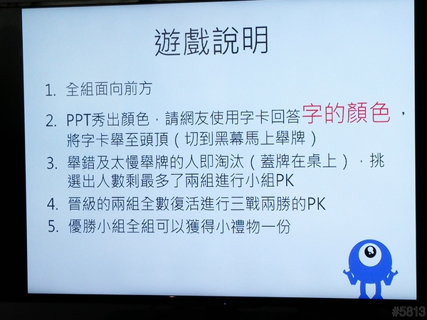 在簡報中間,為了讓網友動一下,玩了個小遊戲,就是看電視播放出顏色拿出正確的字卡。