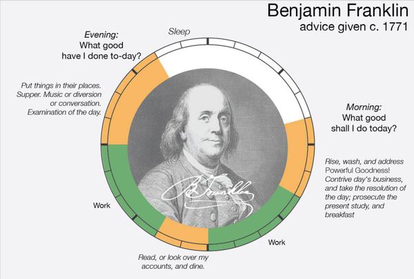 班傑明富蘭克林:十點睡,五點起床。起床花兩三個小時思考今天要做些什麼,睡前又回顧一次。通常他都能心滿意足地睡著。