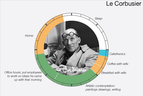柯比意:十一點睡,六點起床。起床後做一小時柔軟操,跟太太聊天、喝咖啡,進行創作,下午到事務所與員工實踐想法。