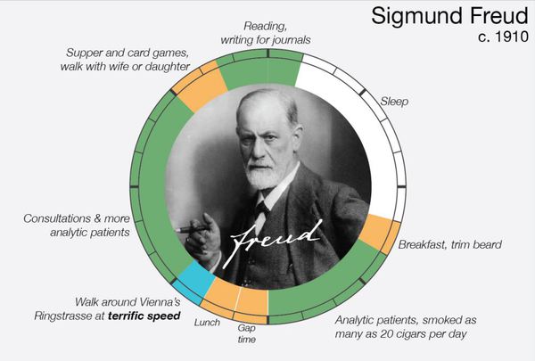 佛洛伊德:工作狂,凌晨一點睡,七點起床。午後要在維也納街頭快走一小時,每天要花十個小時診斷病人,一天少說二十根雪茄。
