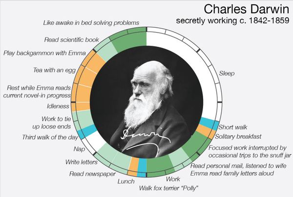 達爾文:十二點睡,七點起床。無法專心做一件事情太久,散步、聊天讀信、發呆、喝茶跟狗玩。