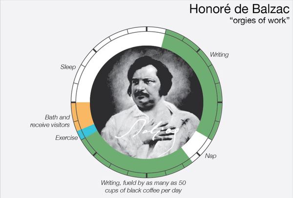 巴爾札克:傍晚六點睡,一點起床,每天寫作超過十二個小時,飲用五十杯咖啡。