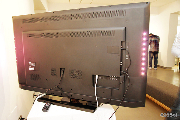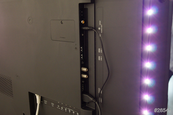 △背面設計簡潔乾淨,輸入端子分成兩個區塊,左右兩排 LED 燈就是「Ambilight 情境光源」!