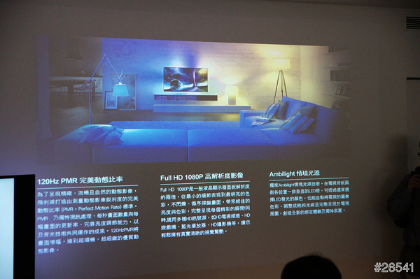 △120Hz PMR 完美動態比率、Full HD 1080P 高解析度影像、Ambilight 情境光源