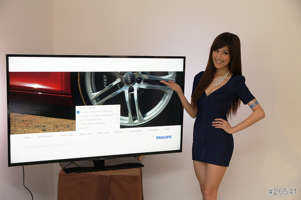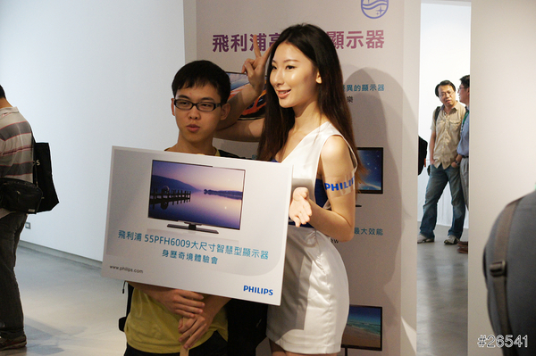 △活潑美麗的主持人跟 Philips 55PFH6009 合照,果然是大尺寸電視以及薄邊框設計,視覺上感覺比一般 55 吋電視還要大。