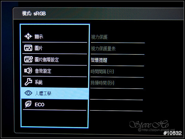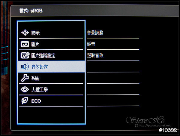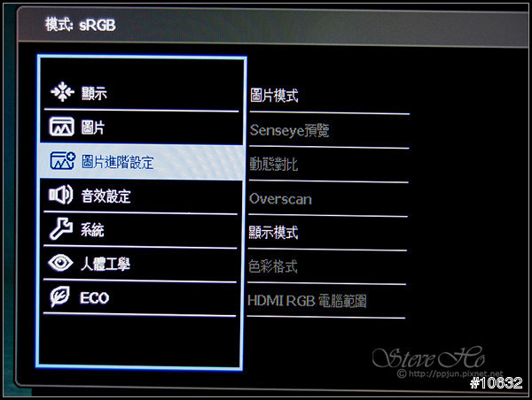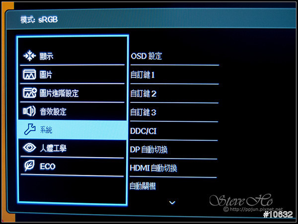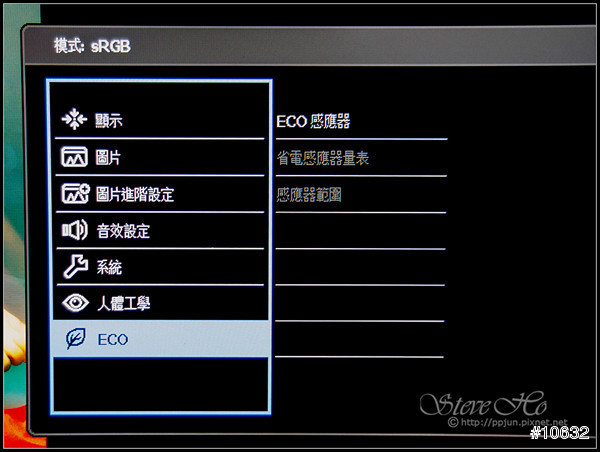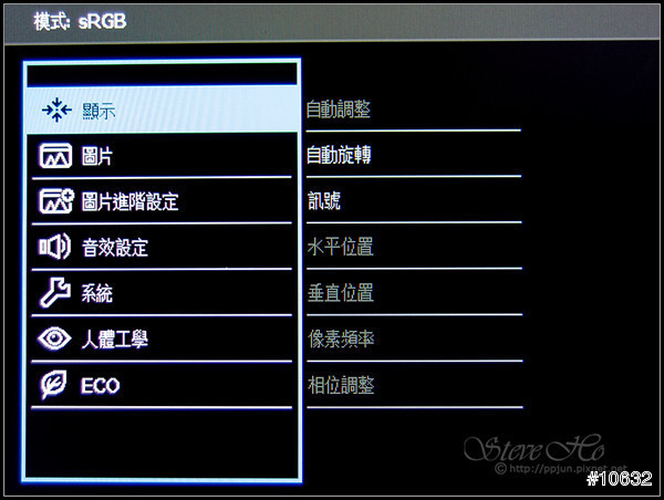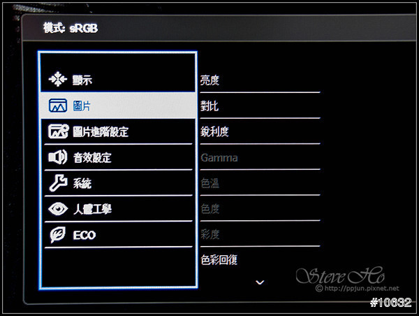 主功能表共有顯示、圖片、圖片進階設定、音效設定、系統、人體工學、ECO等7大項