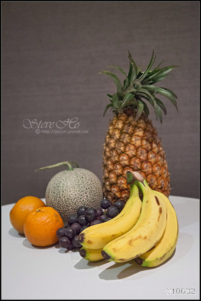 ▼ 皮皮君也試拍了二張,這張是沒有棚燈的效果,可以看見水果下方的陰影非常明顯,水果的顏色也較暗沈