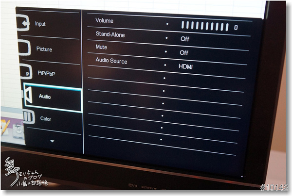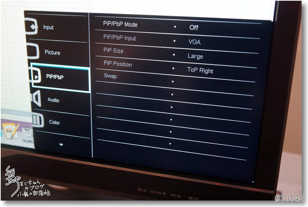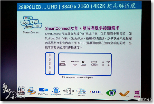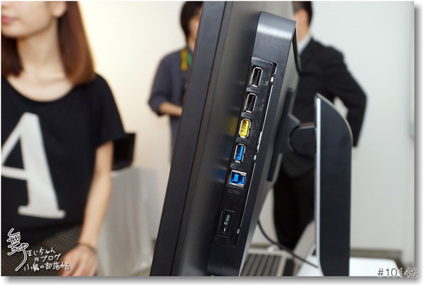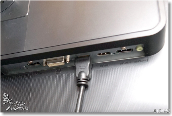 ▲底側的端子則有DisplayPort input、DVI-Dual Link (數位、HDCP)、MHL-HDMI埠、HDMI埠x2、DisplayPort out與音源輸入孔。