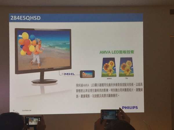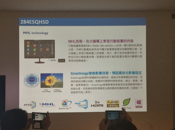 【▼】284E5QHSD也具備SmartImage智能影像技術,會自動判斷影像的對比、色彩飽和度及清晰度來做調整,搭配內建的Mobile HD Link螢幕傳輸分享技術,可將行動裝置畫面推送到284E5QHSD畫面上,讓大家一塊欣賞。