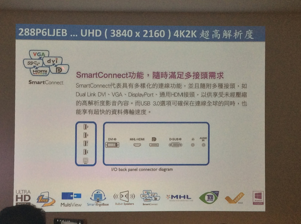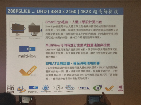 【▼】型號288P6LJEB是會場中最大的電腦顯示器,是搭配比FHD高四倍解析度的UHD,色彩更真實、畫質更細膩。SmartResponse與SmartConnect也是此款重點特色之一。