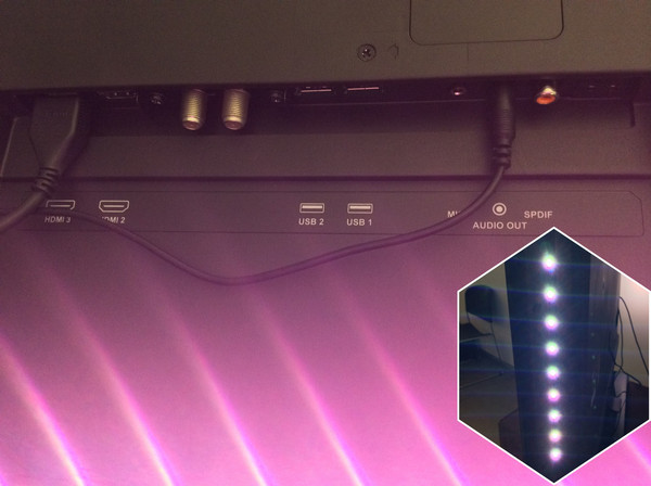 【▼】圖為筆者直著拍,右側面板亦有連接介面,依左至右分別為HDMI-3、HDMI-2、天線NTSC或DVB-T接頭、USB-2、USB-1、麥克風輸入端子、音訊輸出端子與SPDIF光纖輸出端子,而發出粉紅色光芒的就是九顆LED燈構成的情境光源效果。