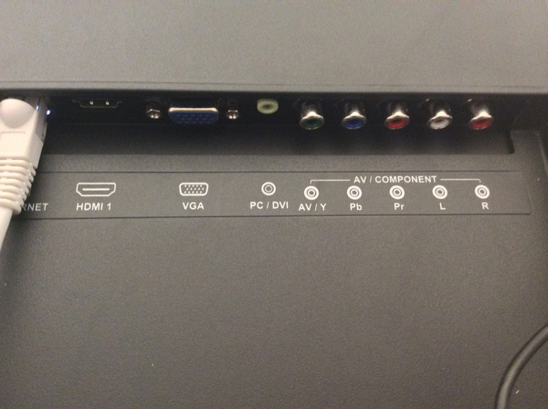 【▼】電視後面的連接介面,依左至右分別為,RJ45網路埠、HDMI-1、VGA、PC/DVI音源輸入端子與一組完整的AV色差端子。