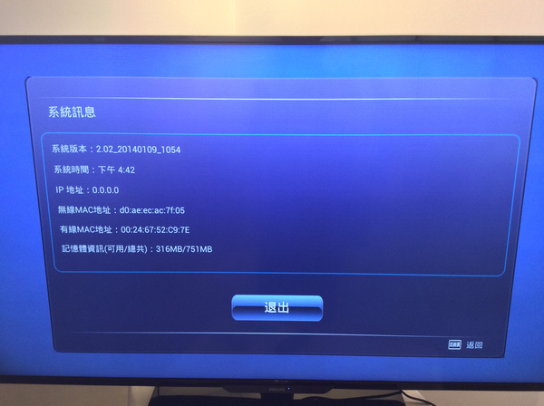 【▼】PHILIPS 55PFH6009智慧型液晶電視內的系統訊息,MAC有兩組,而記憶體總容量為751MB。