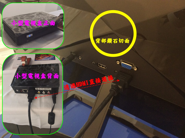 【▼】背部影像連接裝置有VGA*1、HDMI*2,現場連接方式為透過電視盒HDMI輸出到238C4QHSN的HDMI 2輸入埠。