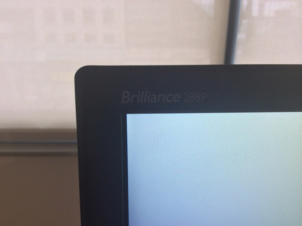 【▼】顯示器左上角印有Brilliance 288P,面板採用TFT-LCD,雖不是極窄邊框設計,但也只有一支手指頭的厚度,在大螢幕顯示器來說還可以接受。