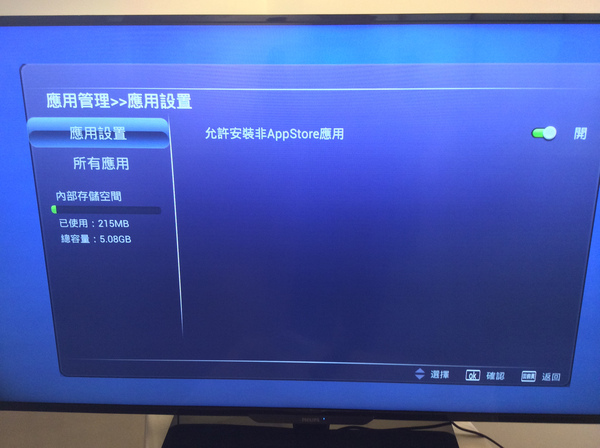 【▼】PHILIPS 55PFH6009智慧型液晶電視內建總容量為5.08GB的空間,一般預設會耗掉215MB,所以還有4GB的空間可供使用者從AppStore下載喜歡的App來安裝。