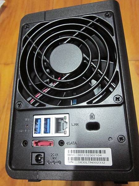 ▼背面照,從上到下,由左至右分別是風扇、Reset鈕、USB 3.0埠*2、網路埠、Esata埠跟電源輸入。