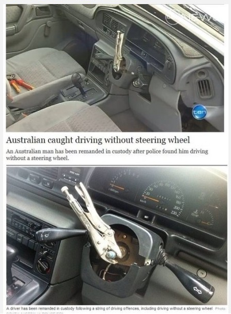 澳洲警方之前攔下一台爆胎的轎車,結果車門一打開,警方都傻眼了,這台車竟然沒有方向盤! 就像俄羅斯人以戰鬥民族著稱,澳洲人則喜歡發揮各式各樣的土炮創意。澳洲的車子方向盤是在右邊的,所以你可以看到,原本是方向盤的位置,現在竟然是卡了一個鉗子來代替。經警方查證,駕駛不但駕照早已經報銷,而且之前還因案入獄,現在還在保釋期,而且還嗑藥開車。 讚 收藏 快速回應 引言回應 共 1 則回應 1 樓 · 布誇張 · 發表於 2014-05-09 12:37 · 檢舉 對不起,此篇回應已被管理員刪除,內容只有管理員可見。