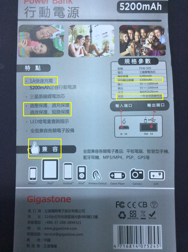【▼】包裝盒後面的介紹,重點有使用1A快速充電、多重保護機制,有效防止過充、過放、過流、短路等現象,平均輸出容量為3200mAh,兼容性幾乎涵蓋所有行動裝置,並提供全球一年原廠保固,所以全球走透透也不成問題。