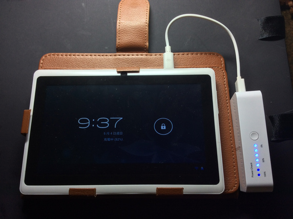 【▼】使用小朋友的Android平板測試看看,可以充電沒有問題,這邊行動電源提供的充電線不長,有助於效率的轉換和減少線損。