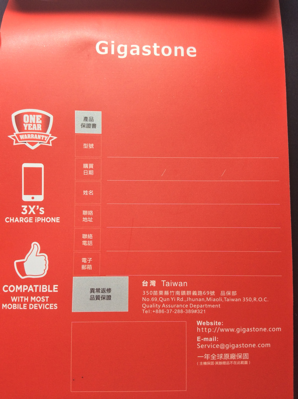 【▼】行動電源的產品保證書,投保1000萬產品責任險,一年全球原廠保固,送修地點在苗栗,非台北內湖。