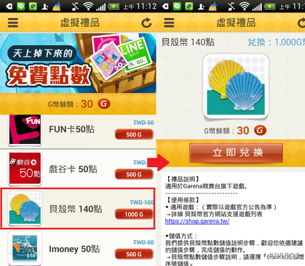 點選兌換禮品中的【虛擬禮品】 然後選擇【貝殼幣140點】