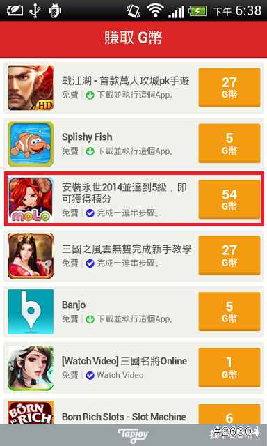 下載各種不同的遊戲就可以賺取G幣,你看看還有一次就可以得到54G幣的任務,怎能不心動。