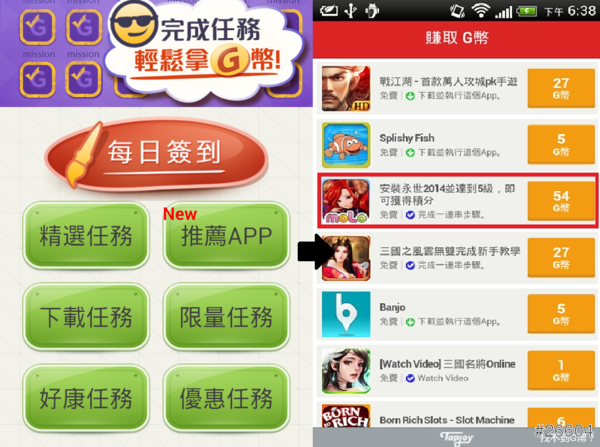 下載各種不同的遊戲就可以賺取G幣,你看看還有一次就可以得到54G幣的任務,怎能不心動。