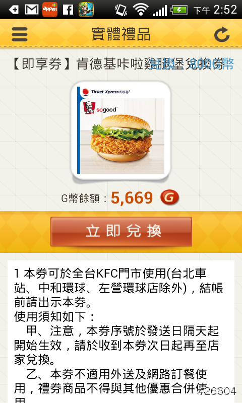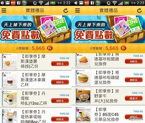 不管是摩斯、丹堤、肯德基又或者是吉野家、85度C,各種種類的實體商品都可以用G幣兌換