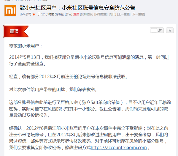 2014年5月13日,我們接獲部分早期小米論壇賬號信息可能泄露的消息,第一時間進行了全面安全檢查。
