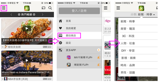 點擊右推式選單,可以看到節目商店這一塊,整合來自專屬雜誌的編目,目前有新聞時事、商管職涯、3C科技、時尚精品、影視娛樂等,內容取向為深度的影音內容。