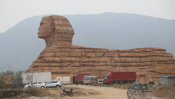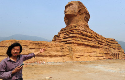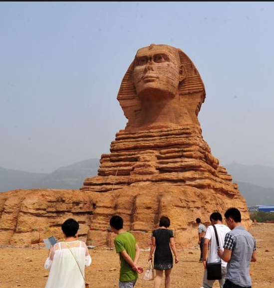 據新華社報導,許多網友在微博上爆料稱,河北省石家莊市出現“獅身人面像”,與埃及的原版著名景觀非常相似。這座獅身人面像位於石家莊市西郊,整個雕像身長約60米,身高約20米。據現場一位施工工作人員介紹,這座雕像內部用鋼筋焊接,再用水泥澆築,最后進行涂色處理。“獅身人面像”有三個門,可以進入內部。