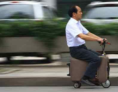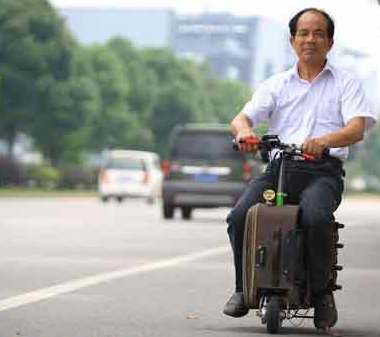 坐上行李箱,在手柄處旋動開關,“行李箱”就像電動摩托車一樣起跑……與普通行李箱相比,多功能行李箱多了個類似滑板的手柄,上面安裝了不少功能按鈕和旋動開關,下面著地的三個輪子同樣很小,電瓶就是一塊可充電的鋰電池,不占地方。賀亮才說,他發明的這款多功能行李箱,具有電動、導航、防盜、存物、載人的功能,輕便小巧,自身重約7公斤。