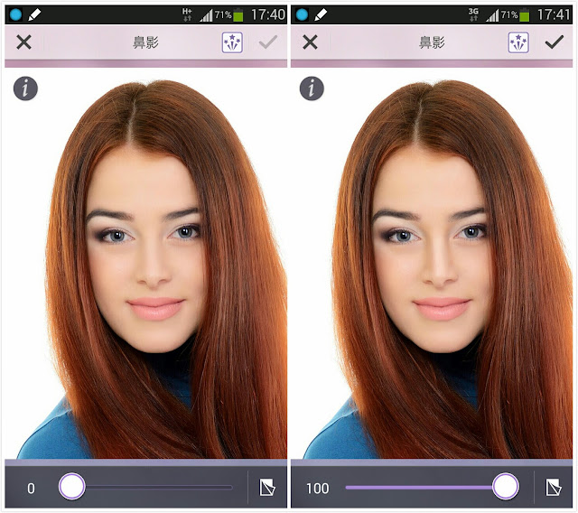 再來女孩兒要示範的是新更新的功能鼻影工具,會讓整體的五官看來更加立體,不過一樣女孩兒妳太白晰又笑容可掬,所以一樣很不立體了哎~哈哈