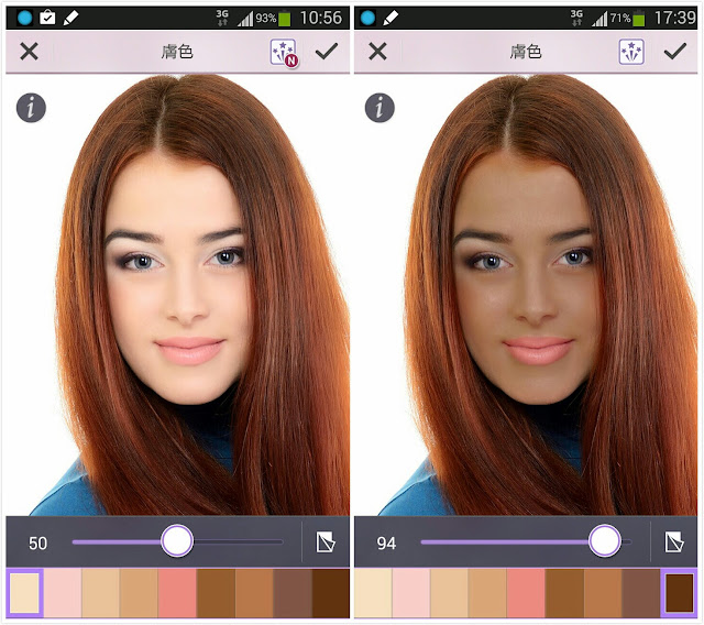 可以透過內建設定的由白晰到小麥膚色去選擇自已的肌膚色調,女孩兒就來示範成可愛的小麥色嚕。