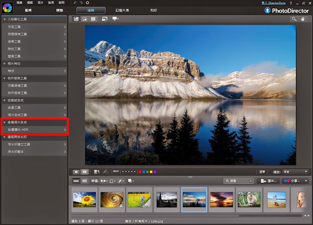 開啟主操作畫面中的編輯功能選單,可以找到多幅相片合成→包圍曝光HDR