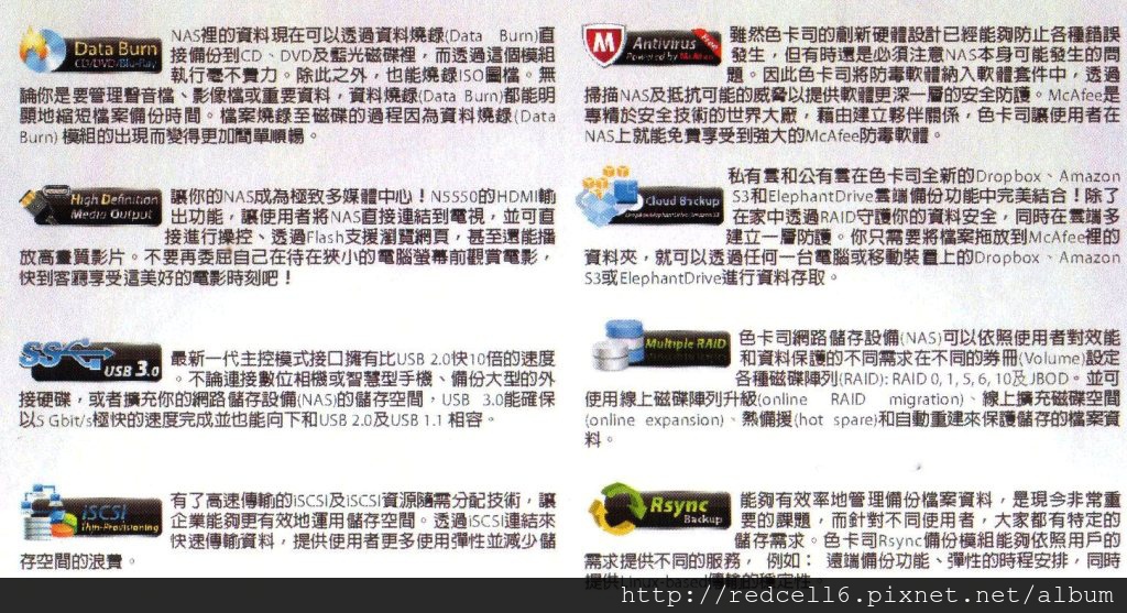 由儲存設備專家色卡司精心打造的N5550 NAS設備,不單單只是硬體規格十分強大(intel Atom處理器及2GB的記憶體),搭配希捷專用的NAS HDD,運作起來低溫長效安靜,且最高可以支援到20TB的超大儲存空間,支援iscsi資源隨需分配技術將儲存資源做最有效妥善利用,使用者也可以按需求自行透過網路去下載色卡司引以為傲世界第一大的Thecus NAS App center軟件下載中心的眾多應用軟體及搭配McAfee防毒軟體,不但可以安全、快速、有效率建立自己或企業專屬固若金湯的公有或私有雲端系統,備份的部分也對應多樣的方式去做備份,也支援Data Burn資料燒錄的方式,以DVD及藍光光碟機的方式簡單輕鬆的將重要資料燒錄成ISO映像檔案,色卡司N5550除了在公事上得心應手外,也可以打造多媒體娛樂中心,讓智慧型行動裝置平台及遠方的電腦設備可以N5550為大本營,隨時隨地透過Plex及XBMC等軟體來享受高品質的影音娛樂,色卡司N5550可以說是靜如處子,動如脫兔的一台NAS好機器,重點就是以如此高規的軟硬體規格,價格卻高貴不貴的相當親民,N5550機器本身也有兩年的保固(希捷NAS HDD三年保固),無論是個人或是中小企業都可以安心的將重要的資料檔案交托給值得信賴的色卡司N5550當堅強有力的堅實靠山,謝謝大家。