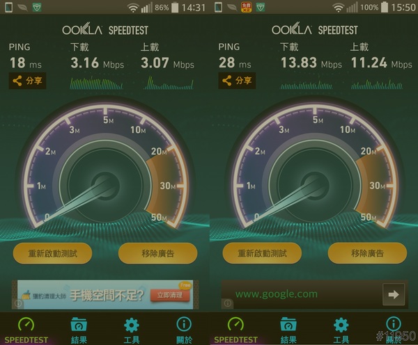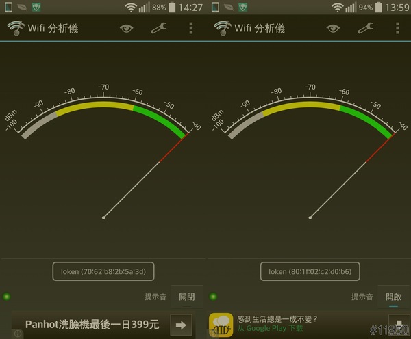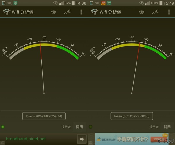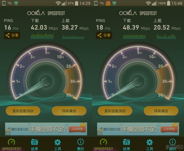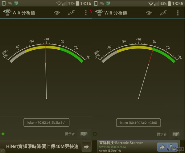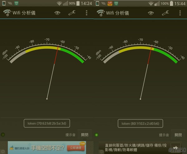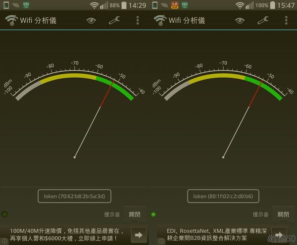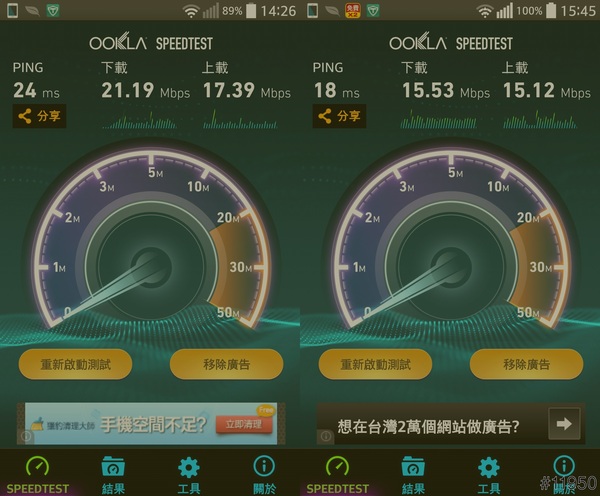 以下數據為筆者房間所測得,距分享器4.5公尺隔2道牆