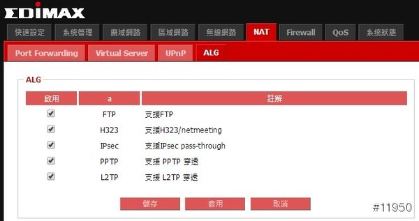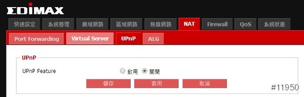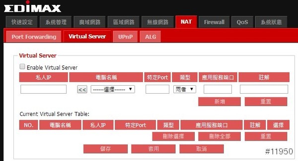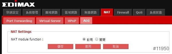 ▼NAT設定頁面中可以進行 Port Forwarding、 Virtual Server、 UPnP和 ALG設定