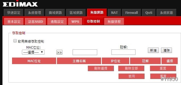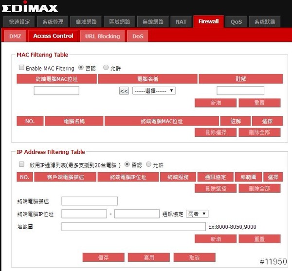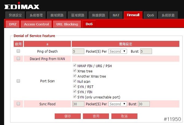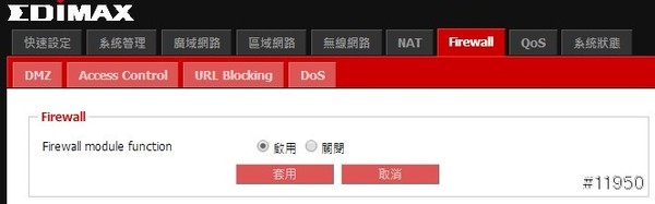 ▼防火牆設定頁面中可以設定 DMZ、 Access Control、 URL Blocking和 DoS