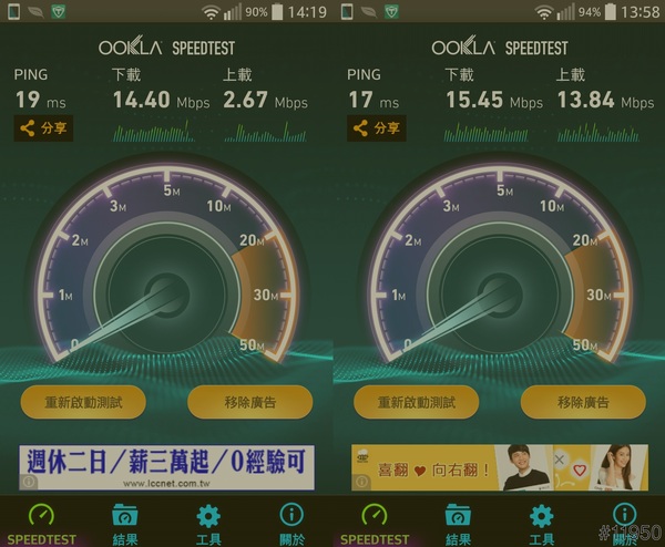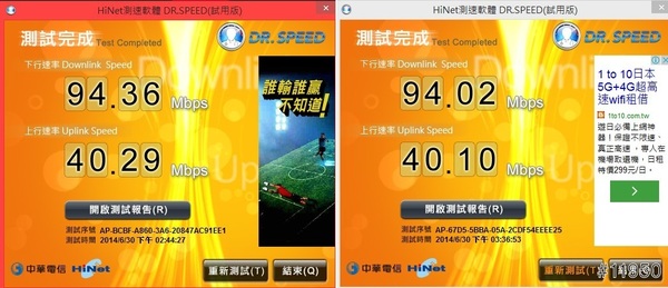 ▼HiNet DR.SPEED所測出來數據兩者都是94M/40M