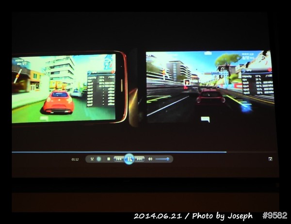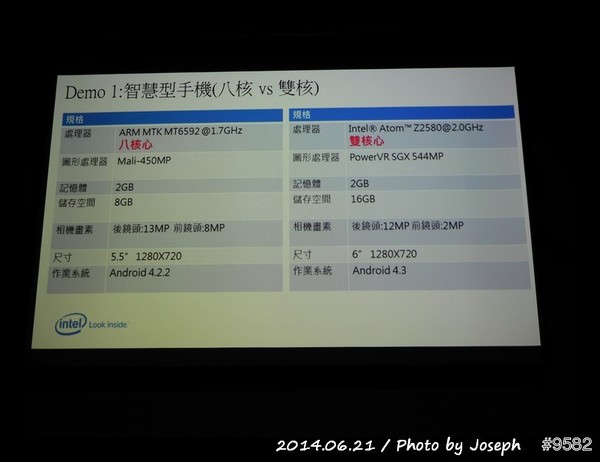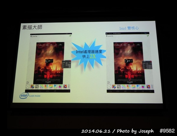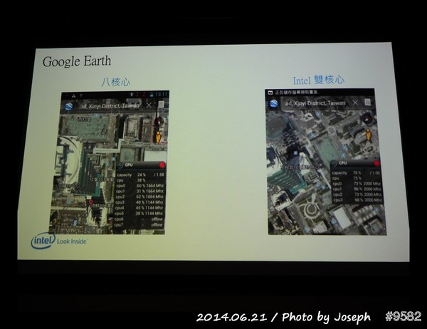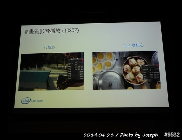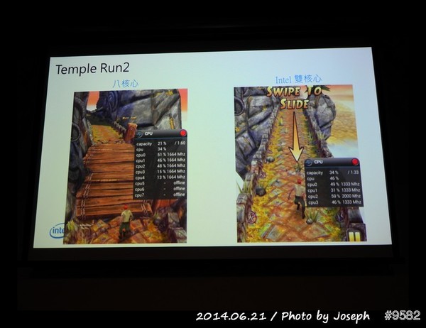 在簡短介紹完INTEL晶片產品之後,便開始了研討會的第一場DEMO,由X86架構與ARM架構晶片作比較。Slide的左邊是八核心ARM晶片(MTK),右邊則是X86的Dual core with HyperThreading INTEL晶片,在相同的狀況下使用,可以發現左邊雖然是八核心的架構,但是8cores並沒有同時運作,而右邊的X86晶片,則是可以看到4cores是同時運作,在這種狀況下可以發現右邊X86晶片是播放影片與玩遊戲是較為順暢,也因此可以得知,不是晶片硬體上有核心愈多愈好,還要加上作業系統與應用程式的最佳化,這樣多核心處理器才是能達到預期的效能,由此可知INTEL在Android系統上投入了很多資源在作X86晶片最佳化處理
