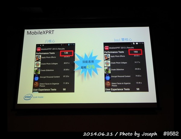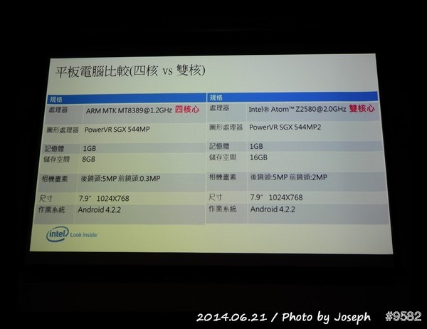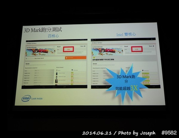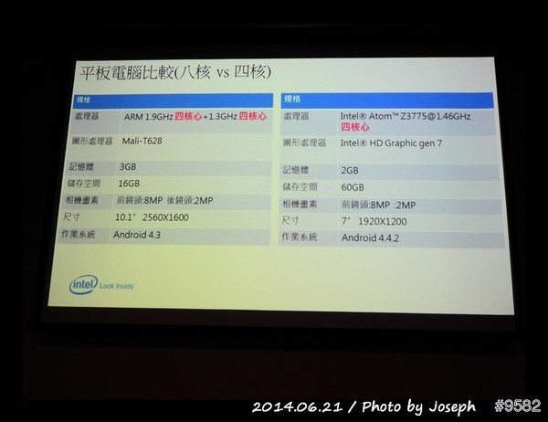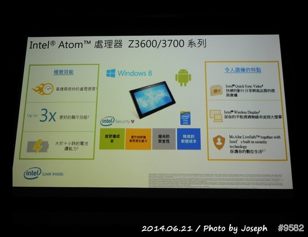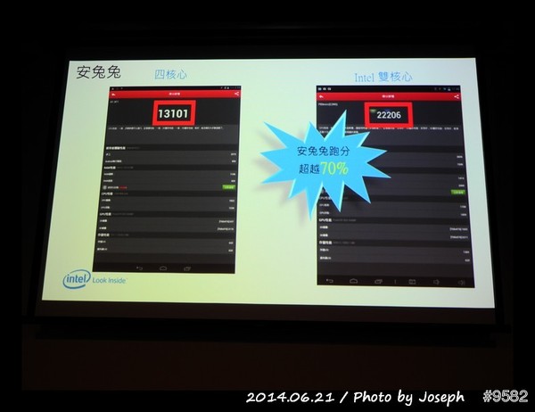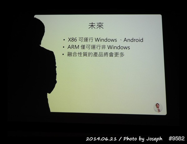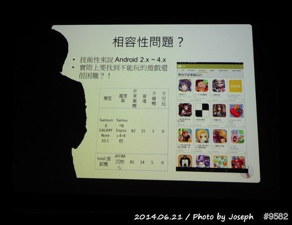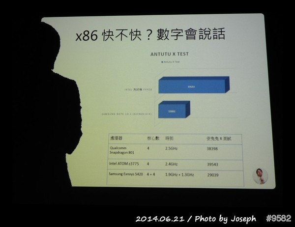 15:50 在實機體驗時間結束之後,第三場講演則是由著名部茖客阿輝 (http://ahuiliao.pixnet.net/blog) 來介紹目前行動運算產品的生態及X86架構晶片的優勢,可以發現INTEL X86晶片這些年來在Android系統上的著墨很深,而且擺脫了以往效能不彰與相容性不佳的惡名,價格上更只有中階手機的價位,擁有高C/P值,對消費者來說是非常好的選擇