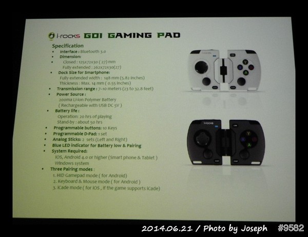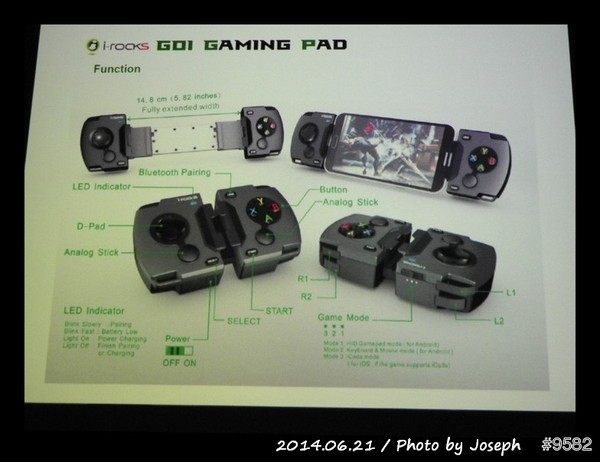 15:20第二場則是由i-rocks的工程師David來介紹手機產品的遊戲周邊裝置GDI GAME PAD,透過藍芽BT 3.0 傳輸與手機/平板連線,有10組按鍵可以定義各自功能,可以支援IOS/Android系統,對不習慣用觸控面板玩game的人來說,這個產品的確是很實用。而且不僅有按鍵功能更是有類比搖捍,真的與電玩主機的操作方式幾乎相同了,讓我們這些嫌觸控平板沒有回饋力道的玩家有機會感受到與電玩主機的爽度