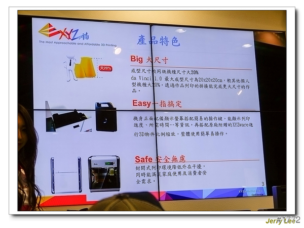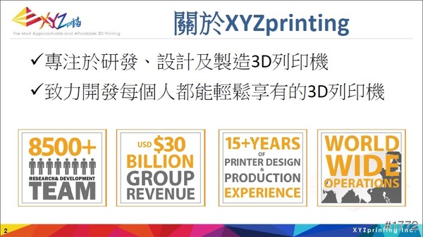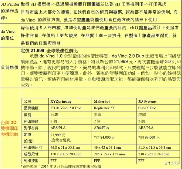 ▲憑藉母企業金仁寶集團,全球共計有8,500名研發工程設計團隊,2013年整體營業額高達三百億美元,旗下新金寶集團超過15年與國際大廠合作製造印表機的豐富經歷,擁有高產能、高品質的產業整合經驗,以及運用全自動化生產作業,健全的製造體系,配合精密的儀器,使得高生產良率的目標得以達成,讓XYZprinting在關鍵的研發、生產、製造設計上能卓越不凡。(簡單來說是個非常具有強大資源與人才,所以有如此強大的設計團隊)