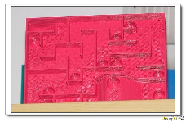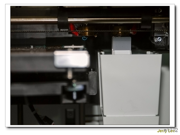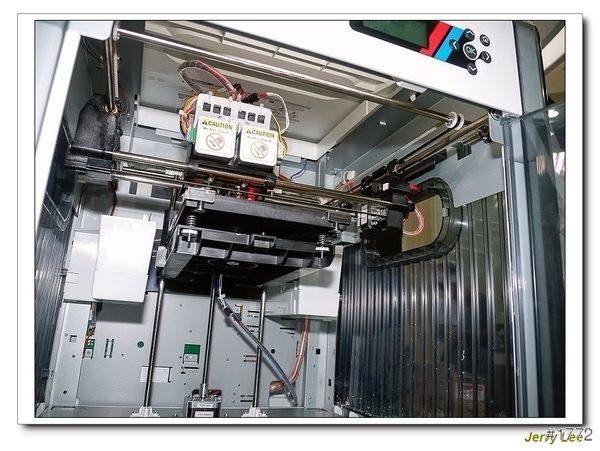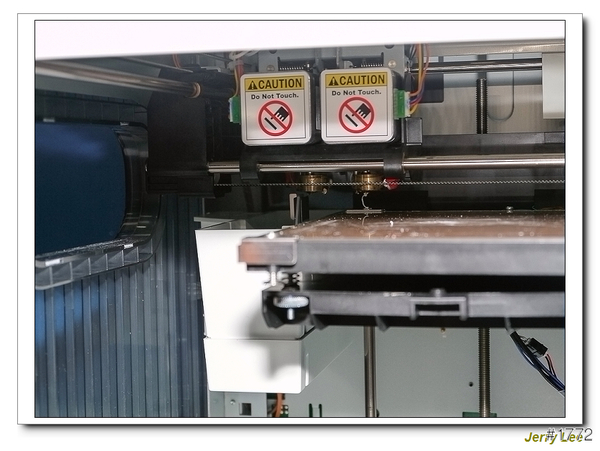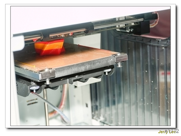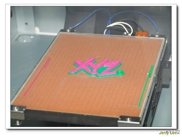 ▲可以看到在列印的平台上左右各一條線,是因為在列印前會測試出料,不過也因為雙噴頭設計,所以最大體積只能列印 15cmX20cmX20cm