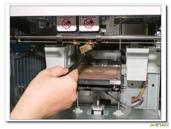 ▲體驗A區,在這裡了解到從線材安裝,經過塑管再到列印機上方的進料處,然後再把線材Load入的過程,在Load的開始會將噴頭加熱到200度,在測試噴頭輸出塑料,測試出料的塑料會收集在兩側廢料盒,選擇清理廢料,可以使用堤供的鋼刷去刷除噴頭阻塞,詳情可以參考以下上傳的影片介紹