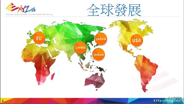 ▲三緯國際以「全球佈局,在地深耕」的策略,從台灣到立足大中華區,由亞洲擴展至歐美,陸續在日本、美國及歐洲等當地設立XYZprinting分公司,積極拓展全球五大洲3D列印市場。 (看來版圖遍及世界各地)