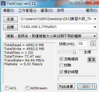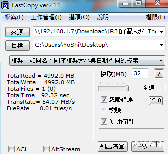 ▲用Fastcopy測試PC與NAS檔案對傳速度,PC傳NAS有64MB/S多,NAS丟PC則約54MB/S多,丟一個4.9G的影片約花50多秒。